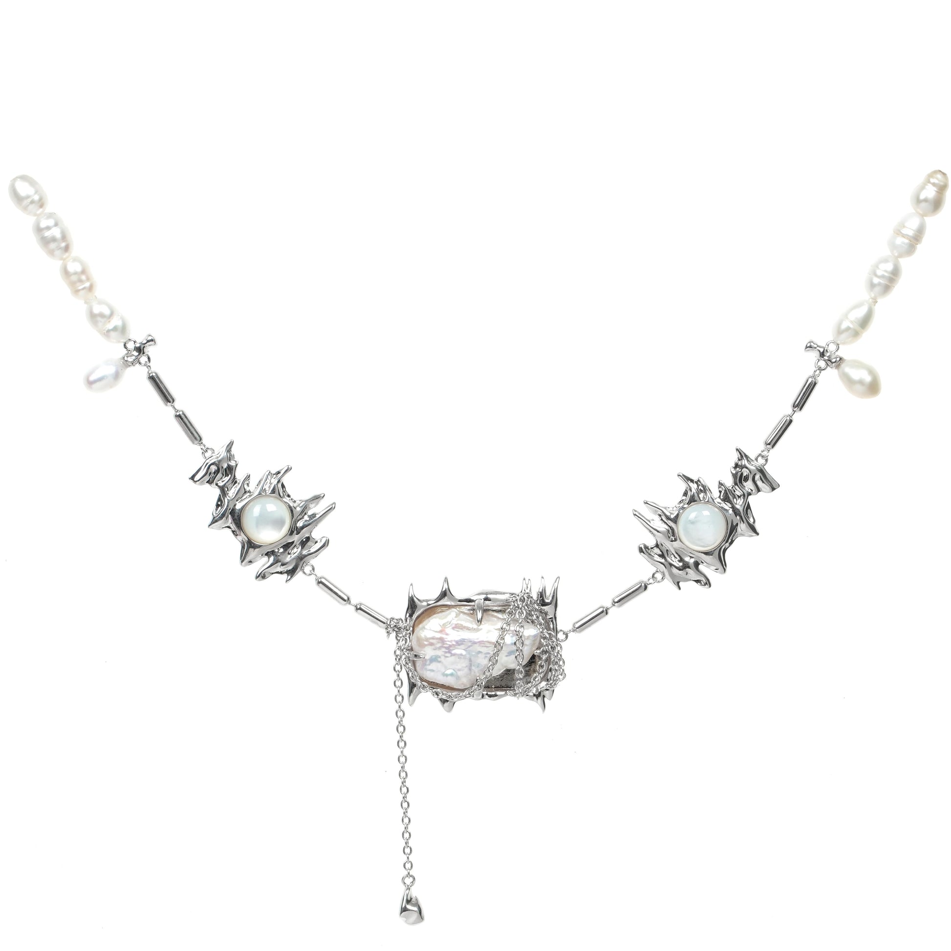 Three unevenly sized wave-shaped square pendants, inlaid with natural mother-of-pearl. The seed pearl necklace is connected wave-shaped pendants, a symbol of duality. Pair with the same collection's Bracelet.